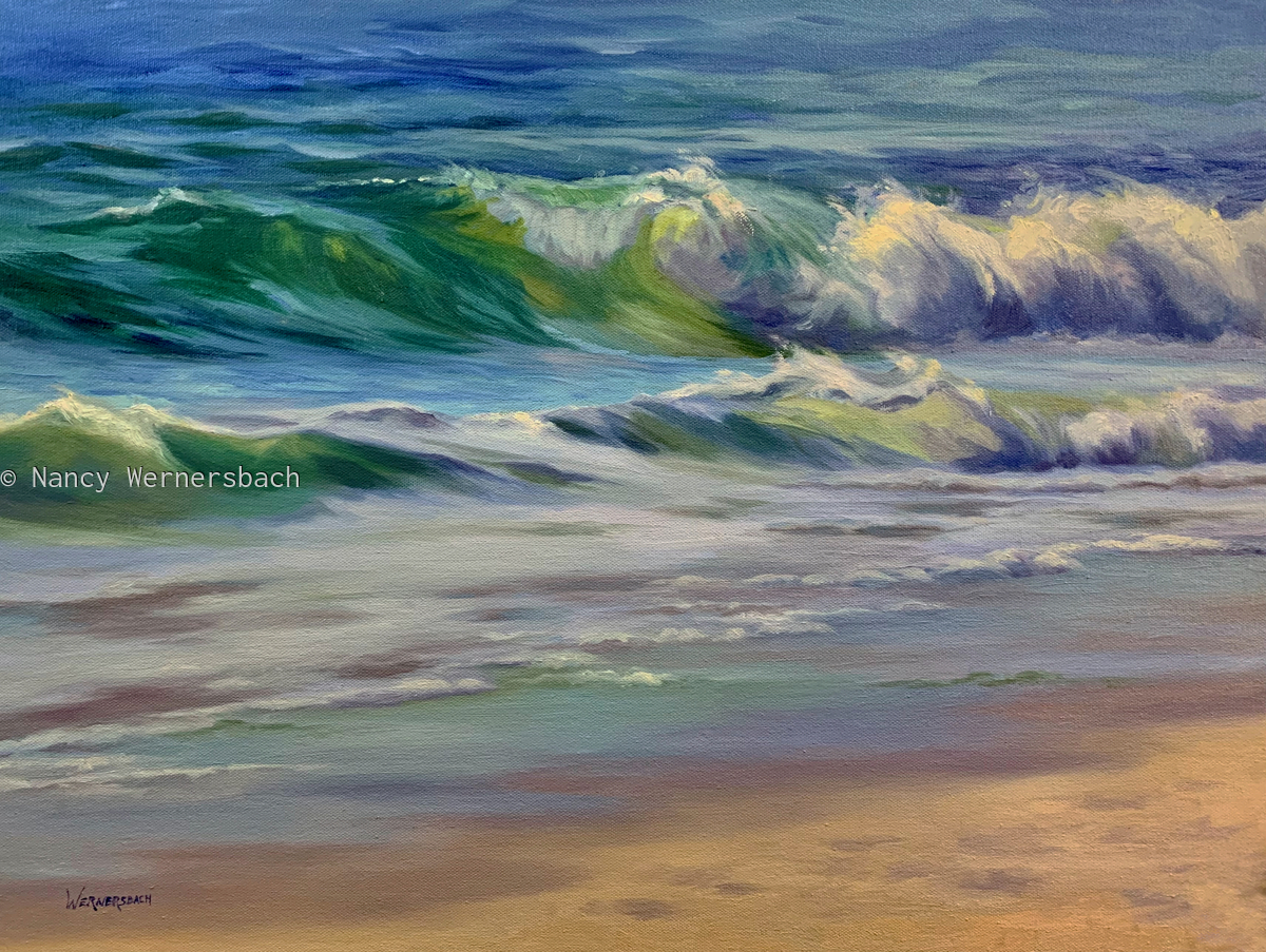 Nancy Wernersbach© Oil Painting ocean waves is truly capturing a matter of seconds in a painting. That wave will never happen the same way again.
